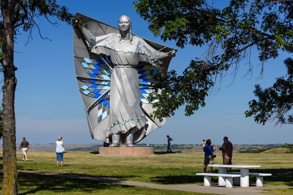 The Dignity sculpture is a stunning combination of art and history. Located next to the Welcome Center on a bluff between exits 263 and 265 on Interstate 90 near Chamberlain, the stainless steel, 50-foot-tall statue was specifically designed by sculptor Dale Lamphere to honor the cultures of the Lakota and Dakota people.