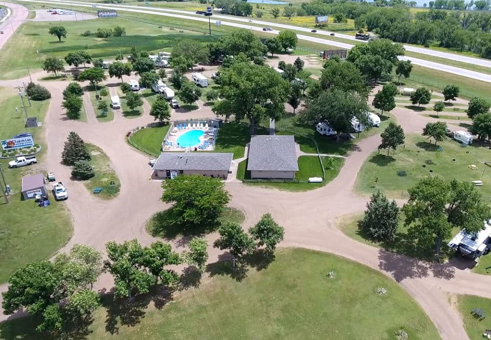 Located on the west side of the Missouri River in Oacoma, the Oasis Campground features full hook-ups, pull-through sites, cabins and a tenting area. It offers all amenities needed to make your camping experience a success. Our shower house offers the finest facilities, including large, spacious restrooms and showers. Complete laundry facilities and recreation room are also available, as well as cable TV in the RV sites. Swim in our heated swimming pool and get to know the friendly staff when you grab a treat from the Office! There is also a large play area with playground for the kids. Enjoy South Dakota’s crisp, fresh air in this gorgeous campground.