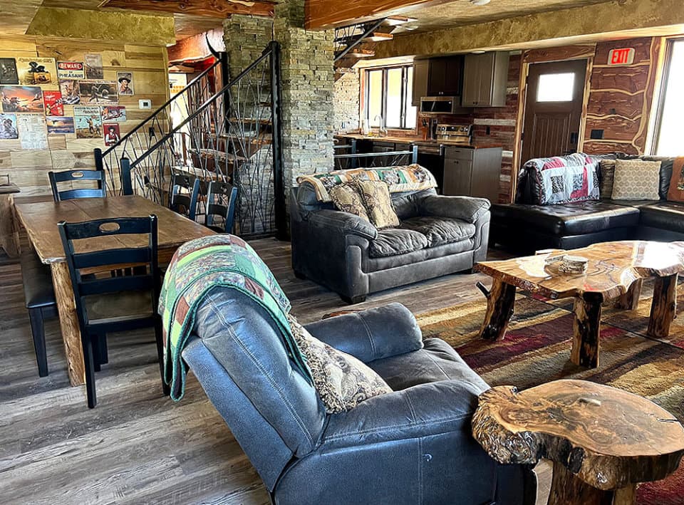 Whether it’s a family reunion, anniversary celebration, intimate wedding, birthday party, quilters’ retreat, team-building workshop, pheasant hunt, or simply a fun weekend getaway with your favorite people, your search stops here. Our secluded, 9-bedroom lodge features a full kitchen, 8.5 baths, game room, screened porch, and patio complete with a wood burning fire pit. With 4 king and 10 queen beds, we can comfortably accommodate up to 28 overnight guests. During hunting season (September 1-March 30), package hunters have preference, but if the dates you would like are available, we would love for you to book your stay.